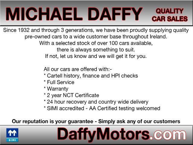 Price Quoted For Straight Sale. Trade-In Welcome. Finance Available Contact Brendan on 068 47001 or email daffycarsbrendan@gmail. com. This quality car has to be seen and driven to be appreciated without a blemish both inside and out. I Any check or inspection welcome. Please ring Brendan on 068 47001 or 087 1515627 to arrange a viewing of this car. Thank you for viewing this Quality Used Car. Always 100 Top Quality Used Cars In Stock. View Our Website: www. michaeldaffy. ie, Air Conditioning, Central Locking, CD Player, Perfect working order, Electric Windows, ABS Brakes, Airbag, Alloy Wheels, Electric Mirrors, Fog Lamps, Immobiliser, Power Steering, Rear Spoiler, Sports Seats, Centre Armrest, Climate Control, Multiple Air Bags, Parking Sensors, Trade in accepted, Isofix, History Checked, Finance Checked
